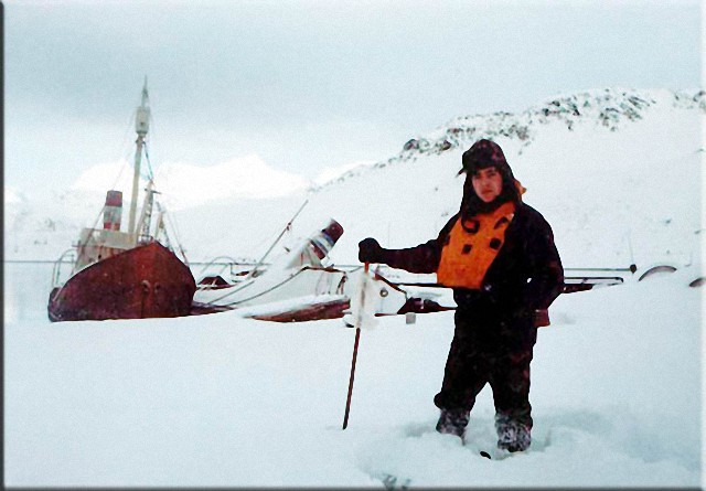 Kevin, a Royal Navy Diver during the conflict in 1982, in front of Dias and Albatros.