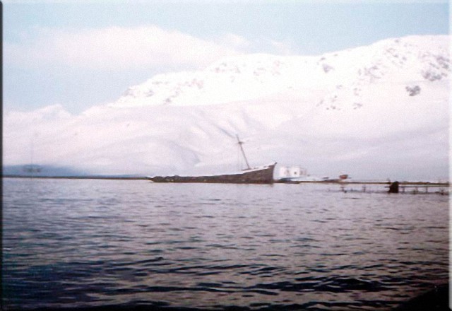 The hulk of Louise at Grytviken before fire burned her to the waterline.