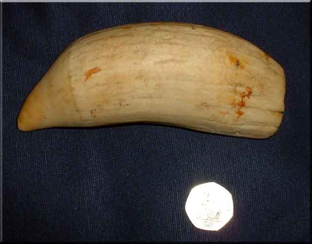 An adult Sperm Whale (Physeter macrocephalus) tooth alongside a fifty pence piece. Due to lack of use over centuries, the teeth regressed and only the part above the ridge seen on the left was above the gum level.