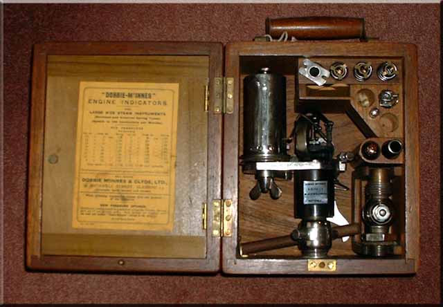 The "Dobbie-McInnes" Indicator Gauge from the factory ship Rosshavet. (Ross Sea) This is the condition it is in today and it is a credit to the Chief Engineer who obviously looked after it very well. It is complete with all springs, rules and even has a little of the lubricating oil left in the bottle. (Centre right.)