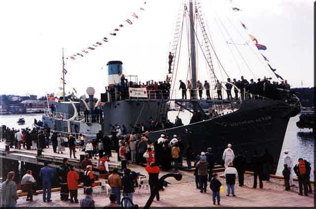 The Southern Actor (now a museum shp) arrives at the quay in Sandefjord at the end of April 1995, after a full refit, bringing her to as near to her original condition as possible. She was built in 1950 for Sevilla Whaling Co. Ltd. and managed by Christian Salvesen & Co., Scotland. She is seen here in her original Salvesen livery.
