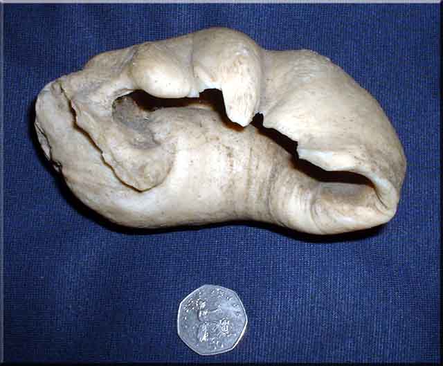 The ear-drum from an adult Sperm Whale (Physeter macrocephalus) with a fifty pence piece to give an idea of the size. The bone is as dense as rock and was the only part of the whale left after the bones had been through the final furnace. "Scrimshaw" was practiced on these bones for hundreds of years. Others were painted, often with a human face.