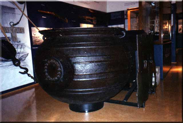 We can see one of two Tri-Pots or Cauldrons that were used to render the oil from the seal blubber. Normally two cauldrons would have been joined together and bricked in to make a cooker. (Note the removable side plates.) One would run into the other, then into a settling container. The two cauldrons in the exhibit were found at Cauldron Bay, South Georgia, around 1800.