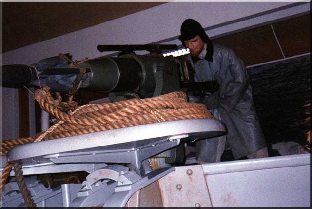In this model of the bow of a whale catcher, the gunner stands ready to fire the harpoon gun. The gunner was also the skipper of the ship. A good gunner/skipper was in great demand and could command a very high salary.