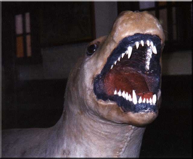 Leopard Seals are solitary animals and very aggressive. After taking a look at these teeth, a museum specimen would be as near as any right-minded person would want to get to one of these animals. The females are much larger than the males, reaching a length of 4 metres.