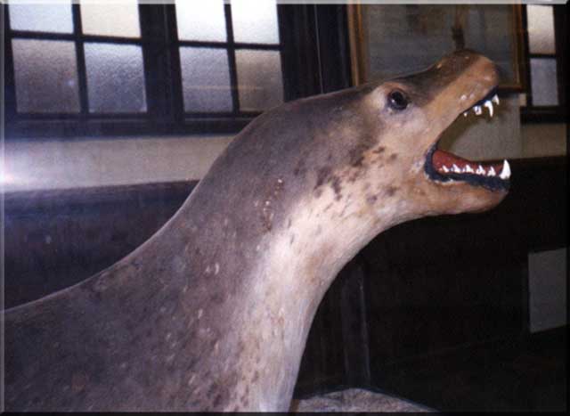In the Natural History section of the Whaling Museum at Sandefjord are a number of exhibits covering most of the animals and birds to be found in the Antarctic. This is a very old specimen of a mounted, rather reptilian looking Hydrurga leptonyx, the Leopard Seal.